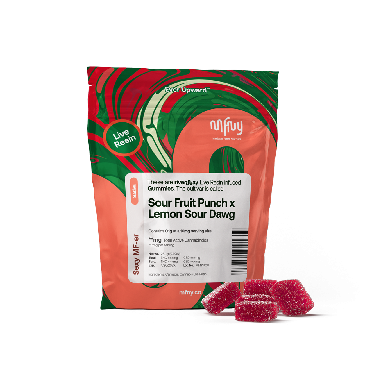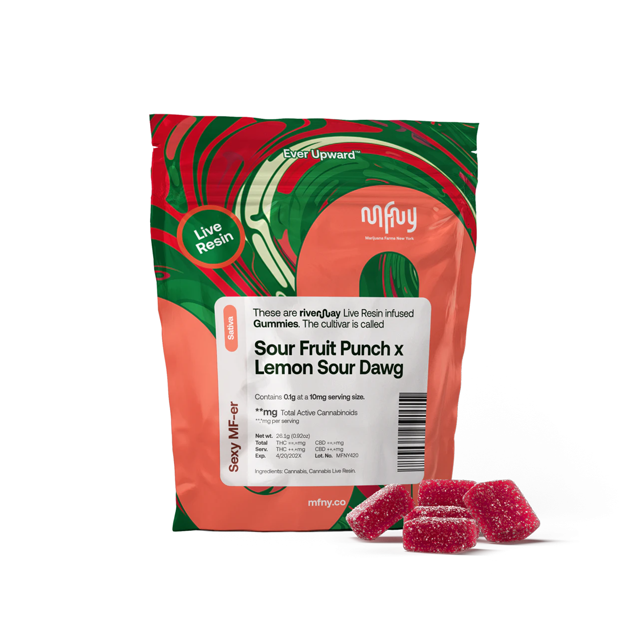 Terpene-rich edibles at an even tastier price. Introducing our live resin Sour Fruit Punch x Lemon Sour Dawg gummies. These vegan gummies are infused with MFNY’s single-source, in-house produced Lemon Sour Dawg live resin. We start with fresh-frozen flower buds, then use the hydrocarbon extraction method (plus years of experience and scientific precision) to deliver the purest plant extract. An extract that showcases the cultivar's naturally-produced, full-spectrum cannabinoids and remarkable natural terpenes. Lemon Sour Dawg is known for its flavor including notes of lemon with a sweet dough backend. To complement the Lemon Sour Dawg cultivar, we add the minimum amount of sugar, plus Sour Fruit Punch flavors.