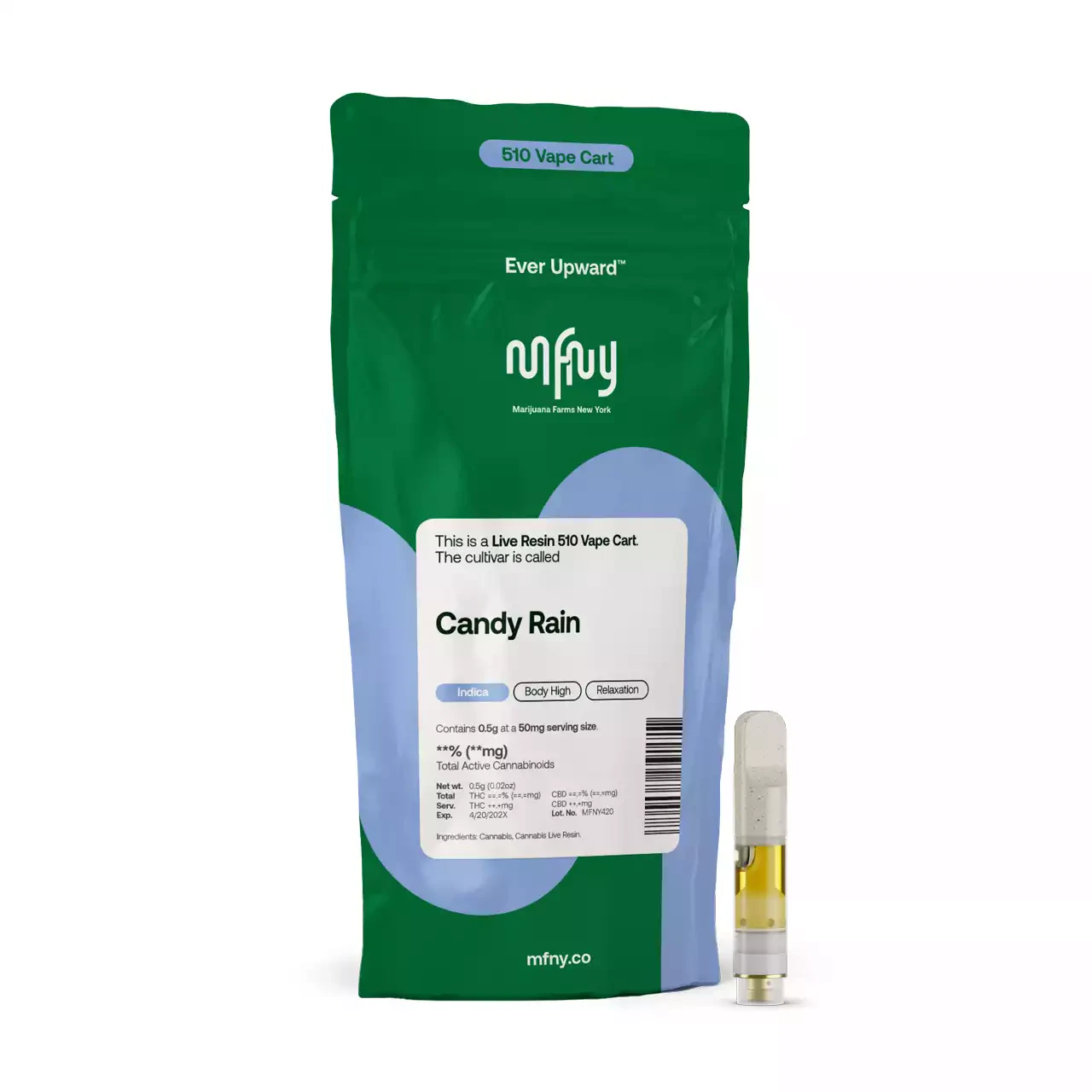 The MFNY live resin vape cart has a terpene-rich profile of our single-source, in-house produced Candy Rain real live resin. We start with fresh-frozen flower buds, then use the hydrocarbon extraction method (plus years of experience and scientific precision) to deliver the purest plant extract. An extract that showcases the cultivar's naturally-produced, full-spectrum cannabinoids and remarkable natural terpenes. Candy Rain is known for its notes of citrus and berries with putrid undertones, which results in a relaxed body high. No distillates, added flavors, or alterations.