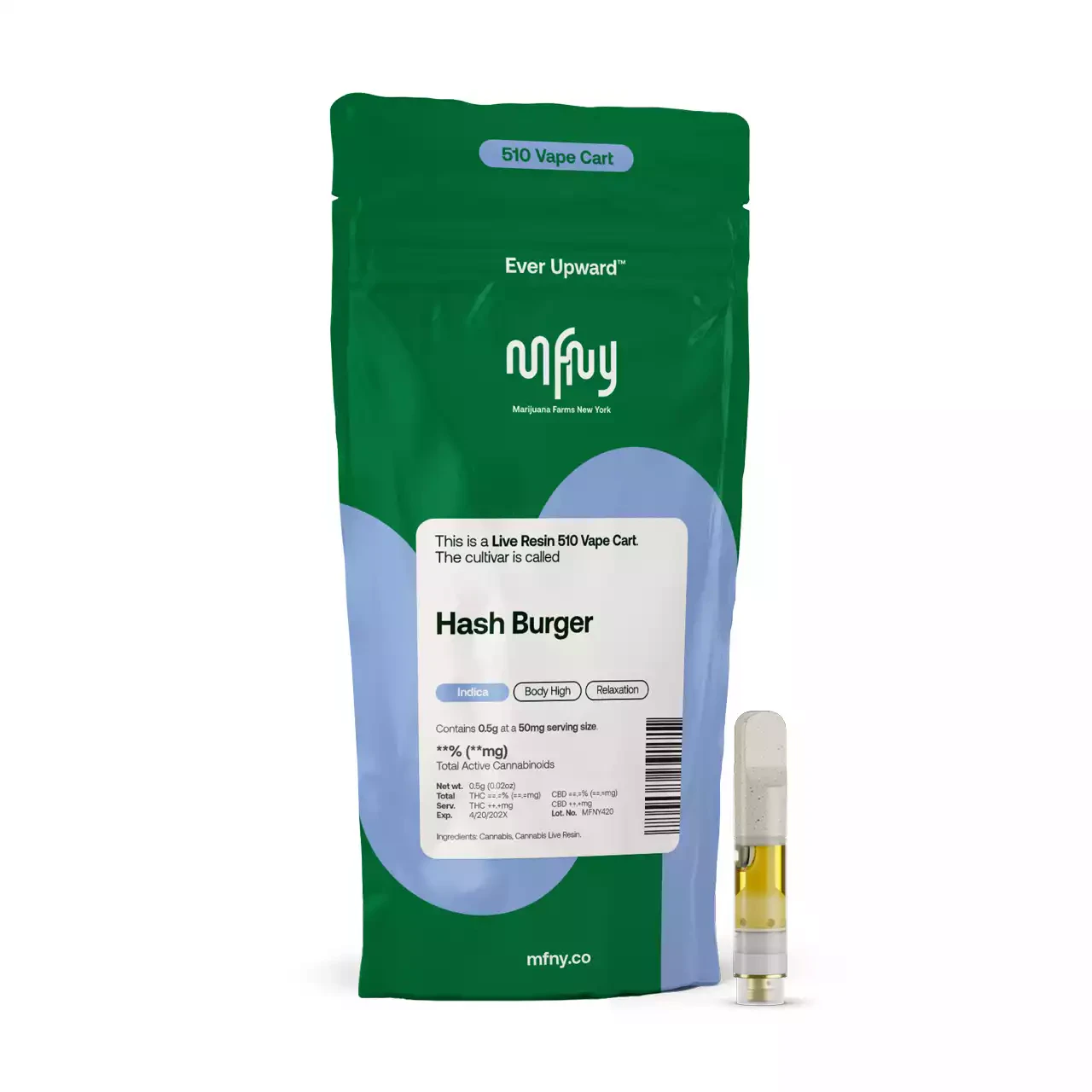 The MFNY live resin vape cart has a terpene-rich profile of our single-source, in-house produced Hash Burger real live resin. We start with fresh-frozen flower buds, then use the hydrocarbon extraction method (plus years of experience and scientific precision) to deliver the purest plant extract. An extract that showcases the strain's naturally produced full-spectrum cannabinoids and remarkable natural terpenes. The celebrity parentage and unmistakable bold flavor of Hash Burger is sweet yet spicy and lemony, finished off by notes of woody pine and fresh flowers. This cultivar is known to promote emotional balance and improved appetite with long-lasting, invigorating cerebral effects that spread to your whole body. No distillates, added flavors, or alterations.
