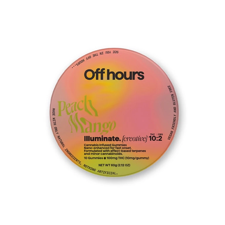 Off Hours peach mango flavored gummies are formulated with a unique combination of THC and CBG to inspire a creative high. Sweet dreams. Nano-enhanced cannabinoids for fast onset. Vegan friendly and gluten free.