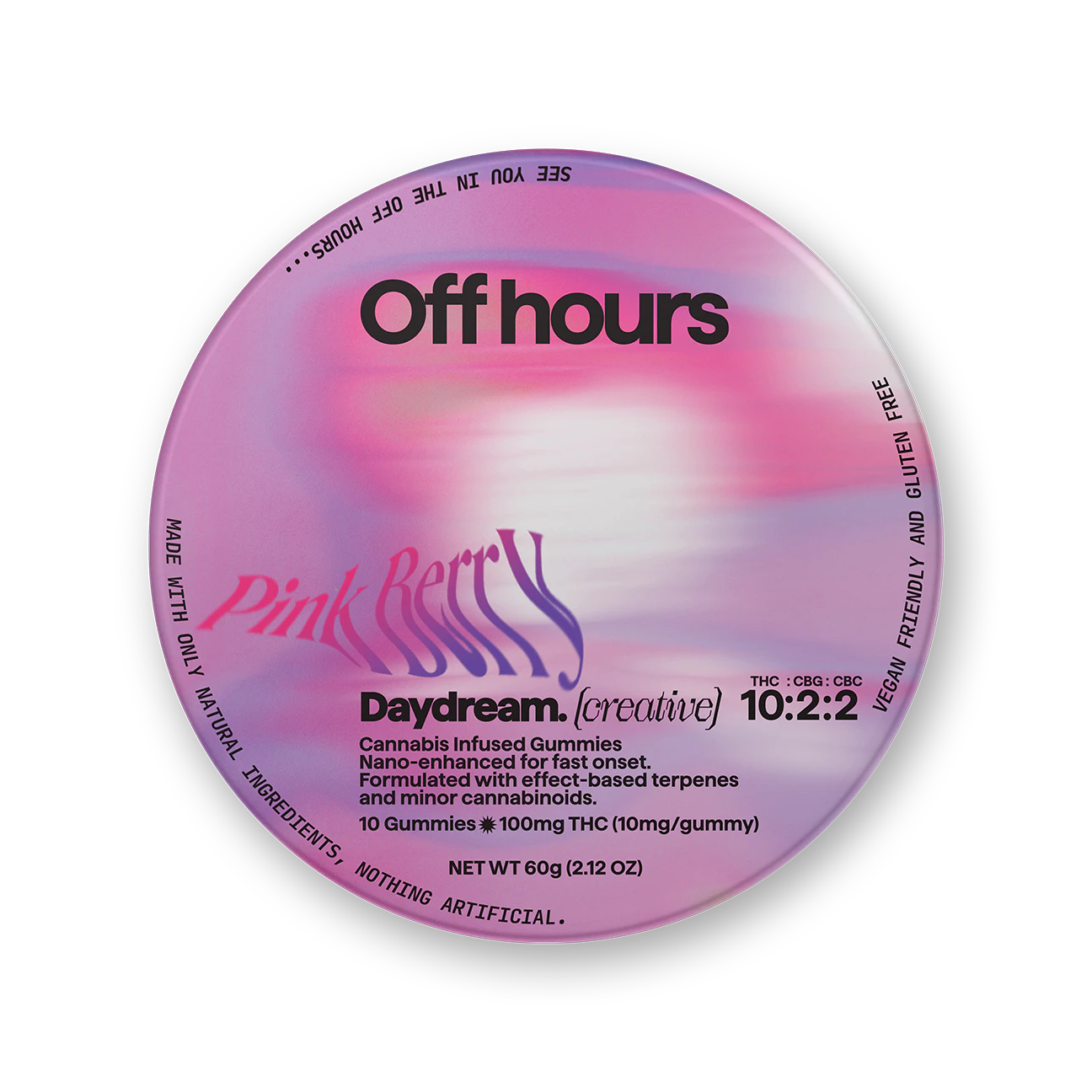Open your mind with Off Hours Pink Berries Daydream gummies. Uniquely formulated with a blend of uplifting CBG and dreamy CBC, these gummies are ideal for inspiring your creative spark and elevating your mood.